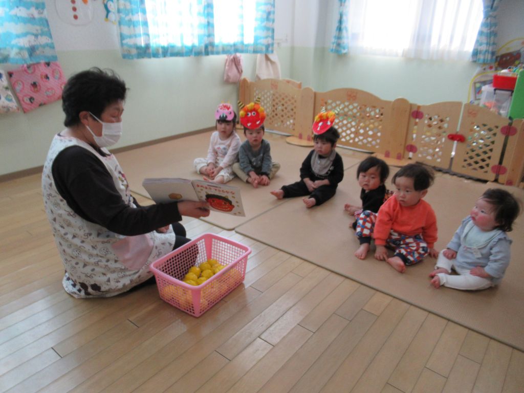 「まめまき」を歌い、豆まきのやり方がのっている絵本を見ました♪